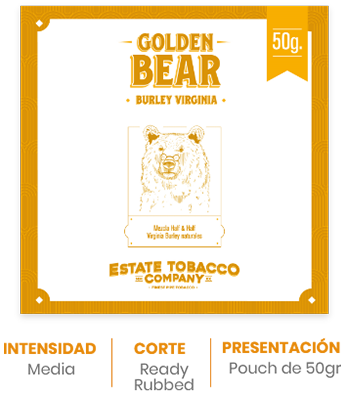 Conocé nuestro tabaco de pipa de Estate Tobacco Company, nuestro Golden Bear Virginia Burley. Redescubrimos el verdadero tabaco natural, en su mezcla más emblemática que llega de la mano de Estate Tobacco Company, un Half & Half que rememora otros tabacos con esta misma receta. El brillante Virginia en corte broken flake y un Burley en hebras que modera los tonos y balancea la mezcla. Clásico de clásicos.